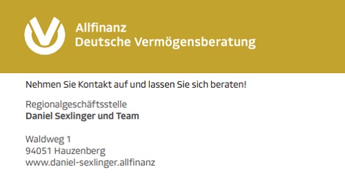 Allfinanz Deutsche Vermögensberatung Daniel Sexlinger Waldweg 1 94051 Hauzenberg https://www.allfinanz.ag/daniel.sexlinger/index.html Tel: +49 (0)151 / 23888815 Fax: --- |