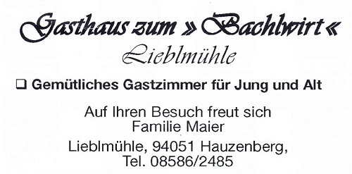 Gasthaus Bachlwirt Lieblmühle 6 94051 Hauzenberg Tel: +49 (0)8586 / 2485 Fax: --- |