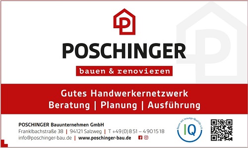 Poschinger Bauunternehmen GmbH Franklbachstraße 38 94121 Salzweg http://www.poschinger-bau.de/ Tel: +49 (0)851 / 4901518 Fax: +49 (0)851 / 4901528 |